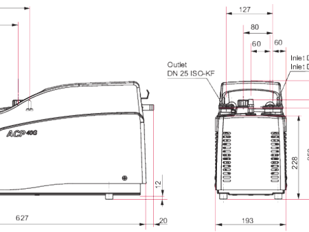 普发真空(Pfeiffer Vacuum)ACP 系列真空泵(如 ACP 28、ACP 40 等型号)的外形尺寸图纸。图纸标注了真空泵的进气口(Inlet)、出气口(Outlet)、吹扫口(Purge port)等接口位置及规格,还有整体的长、宽、高和各部分关键尺寸,用于指导真空泵的安装、与其他设备的连接适配等工作。