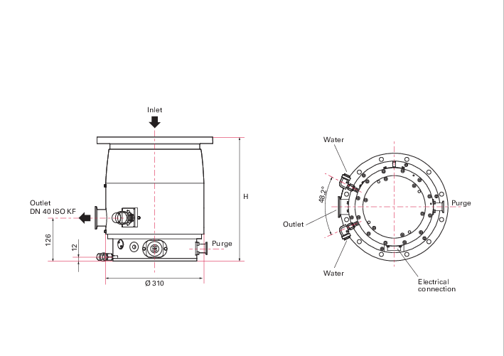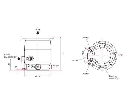 带 DN 40 ISO KF 接口的真空设备部件图纸,标注了进出气口、水路等结构