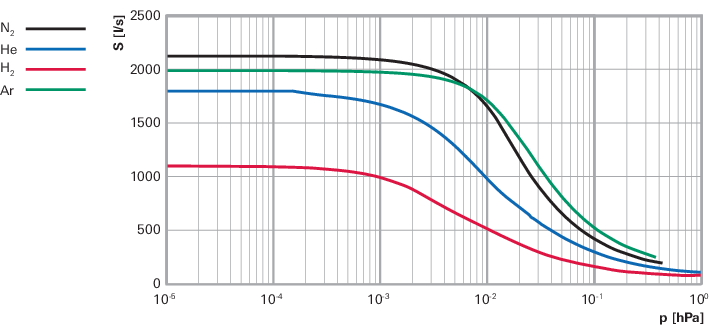 涡轮分子泵对不同气体(氮气、氦气、氢气、氩气)的抽速 - 入口压力特性曲线