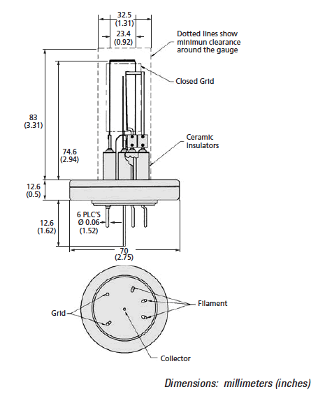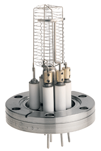 B-A 型热阴极电离规管采用加热灯丝作为电子源。Agilent UHV-24 能够工作在宽工作压力范围下。该规管可以测量低于 2 x 10 -10 torr 的压力。由于直径小,又是封闭结构,其电离速率至少为其他电离规的两倍。收集器直径小,限制了 X 射线电流,同时有助于降低规的压力下限。