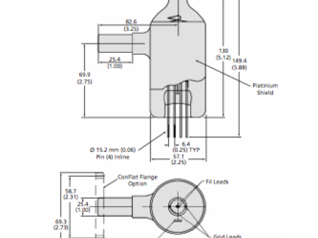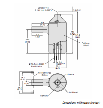 安捷伦 563 B-A 型热阴极电离规管采用加热灯丝作为电子源。该规管在 2 x 10 -10 至 1 x 10 -3 torr 的压力范围内具有卓越的性能。玻璃壳体内部使用铂涂层,可以在较低压力下为真空规提供静电屏蔽,同时又可释放高压下可能积聚的静电。此外,还提供在低于 5 x 10 -6 torr 真空下的校准规,用于测试真空规控制器。