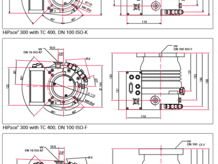 普发真空(Pfeiffer Vacuum)HiPace® 300 分子泵搭配 TC 400 控制器,不同接口(DN 100 ISO - K、DN 100 ISO - F、DN 100 CF - F)的尺寸图纸。HiPace 系列分子泵常用于需要高真空环境的领域,如半导体制造、科学研究等,通过不同的接口类型以适配不同的真空系统连接需求。