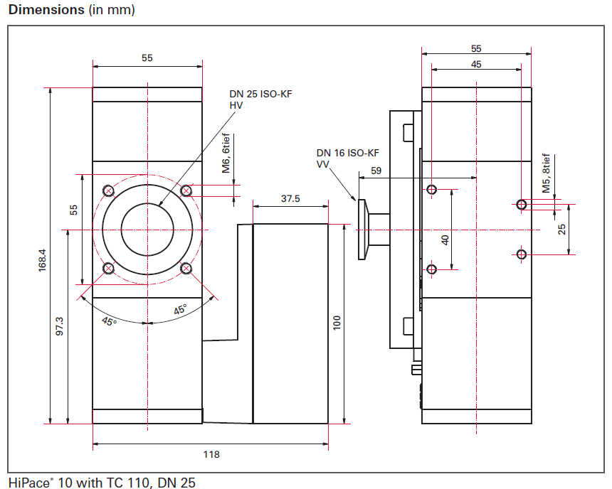 普发真空(Pfeiffer Vacuum)HiPace® 10 涡轮分子泵搭配 TC 110 控制器、DN 25 接口的尺寸图纸。HiPace 系列涡轮分子泵常用于需要高真空环境的场景,如半导体制造、科研实验等,通过不同的接口和控制器配置,满足各类真空系统的连接与控制需求。
