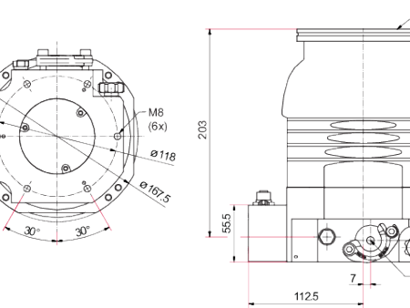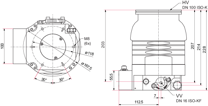 普发 HiPace 系列涡轮分子泵的安装尺寸图纸,标注了该设备的接口规格(如 DN 100 ISO-K 进气口、DN 16 ISO-KF 排气口)、安装孔位(M8 螺栓)及各部位尺寸参数,用于指导设备在真空系统中的安装与适配。