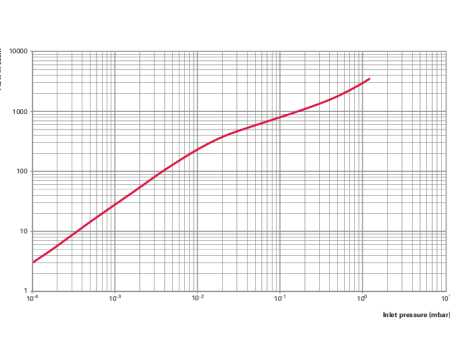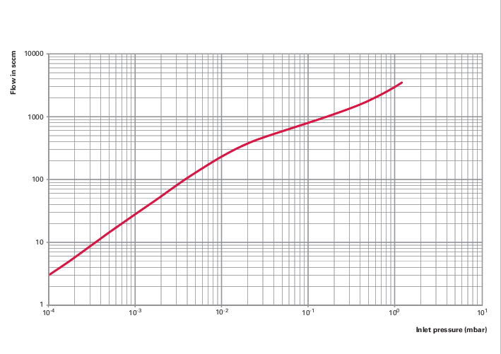 该曲线展示了某真空设备(如真空泵、真空阀等)在不同入口压力(单位:mbar)下的气体流量(单位:sccm)变化关系,反映了设备在不同压力工况下的流量性能,是真空设备选型、性能评估及系统匹配的重要参考图表。