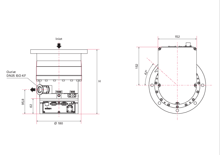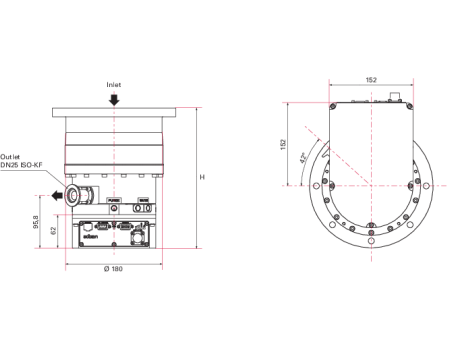 图纸从正视图和俯视图标注了泵体的关键尺寸参数,包括入口(Inlet)、出口接口规格(DN25 ISO-KF)、外形轮廓尺寸(如直径 Ø180 等),用于设备的安装适配、空间布局规划以及技术参数确认,是涡轮分子泵工程应用和机械设计的重要技术文档。