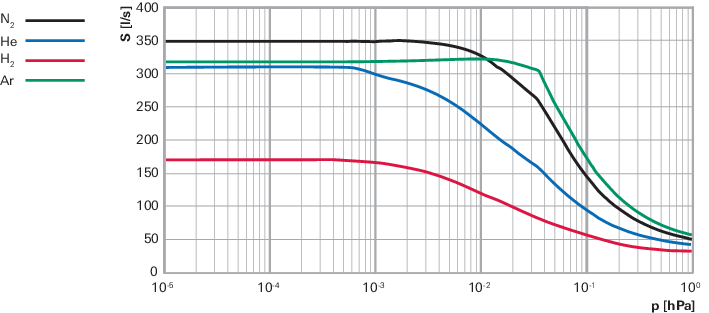 该曲线展示了涡轮分子泵在不同气体(N₂氮气、He 氦气、H₂氢气、Ar 氩气)下,抽气速率(S,单位:l/s)随入口压力(p,单位:hPa)的变化关系,反映了泵在不同工况下的抽气性能,是高真空设备选型和性能评估的重要参考图表。