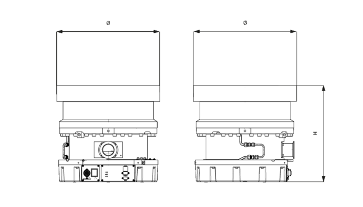 图中展示了该泵的两个不同视角的轮廓与尺寸标注(包含直径 “Ø” 和长度 “T” 等参数),用于指导泵的安装、适配设备腔体的空间布局等工程应用场景,属于真空设备(涡轮分子泵)的机械设计图纸范畴。