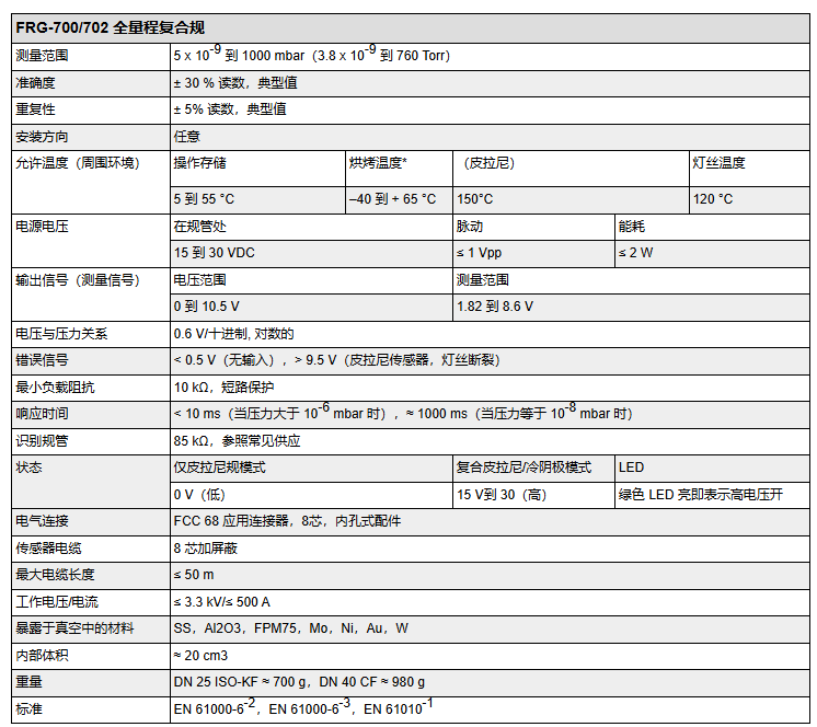 安捷伦 FRG-700 规为全量程规,在紧凑且经济的规管内集成两种测量技术,以测量从 5 x 10 -9 mbar 至大气压(3.8 x 10 -9 Torr 至大气压)的工作压力和极限压力。带有一个对数模拟输出信号的单一紧凑规管可大幅降低安装、设置和集成的复杂性。其优点在于降低成本并显著降低对宝贵空间的要求。FRG-702 为 FRG-700 的全金属型号,内含金属密封的真空密封穿导件。该规管可以在比 FRG-700(法兰处最高 55℃)更高的温度(法兰处最高 150℃)下工作。