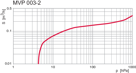 普发真空(PFEIFFER VACUUM)MVP 003-2 型干式隔膜真空泵抽速 - 压力性能曲线图,以进气压力(hPa)为横轴、抽速(m³/h)为纵轴,直观呈现该泵在不同压力下的抽速特性,是其性能评估与场景适配的核心参考资料。