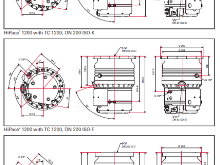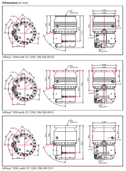 普发真空 HiPace 1200 涡轮分子泵(配 TC 1200 控制器)多接口规格安装尺寸图。它展示了 DN 200 ISO-K、ISO-F、CF-F 三种法兰接口型号的正、侧、俯多视角尺寸标注,为半导体制造、科研实验等场景的设备布局、管路对接提供数据,是工程设计与现场安装的关键技术文件。