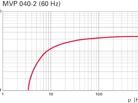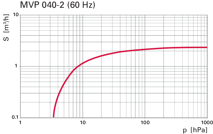 普发真空(PFEIFFER VACUUM)MVP 040-2 型双级干式隔膜真空泵(60Hz 电源适配)的抽速 - 压力性能曲线图,以进气压力(hPa)为横轴、抽速(m³/h)为纵轴,呈现了该泵在 60Hz 工况下的抽速变化特性,是评估其性能、匹配应用场景的核心参考资料。