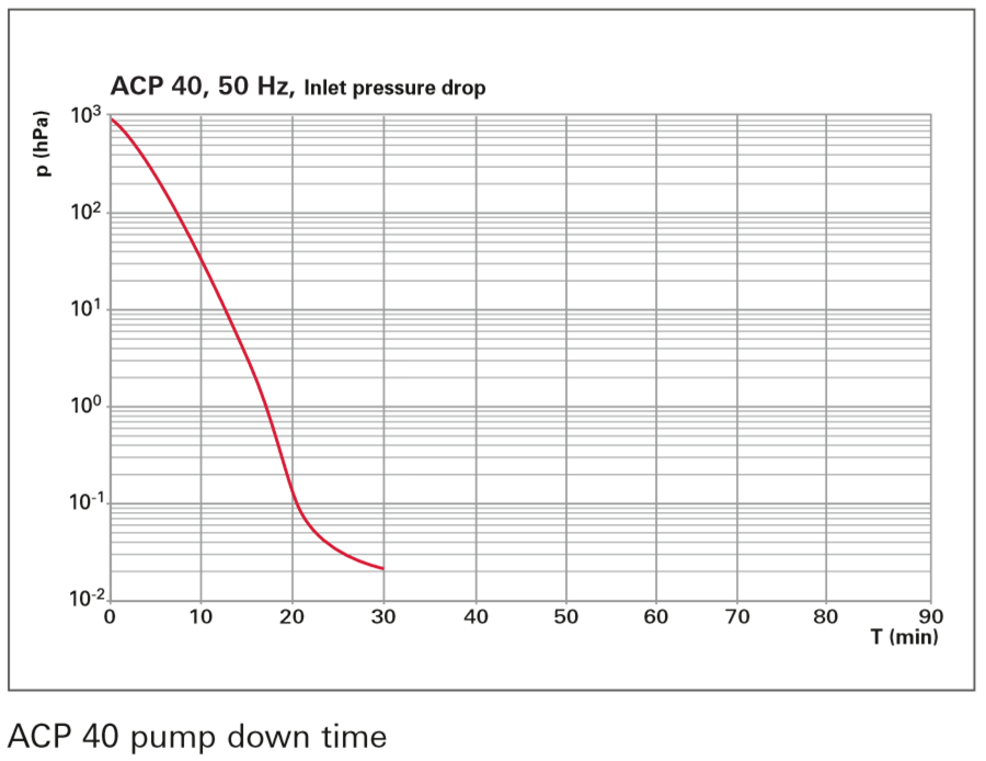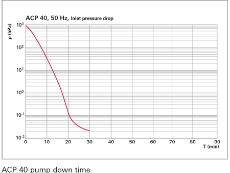 普发真空(Pfeiffer Vacuum)ACP 40 干式隔膜真空泵在 50 Hz 频率下,入口压力降与抽气时间(pump down time)关系的性能曲线图 。横坐标 T(min)表示抽气时间,纵坐标 p(hPa)表示压力,曲线展示了随着时间变化,入口压力降低的情况。