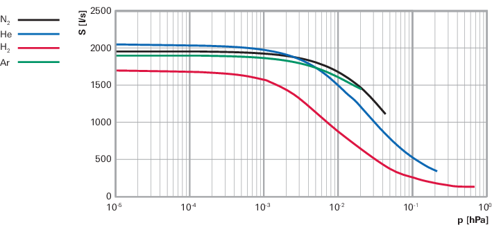 图中展示了该泵对不同气体(N₂、He、H₂、Ar)在不同入口压力(p,单位 hPa)下的抽速(S,单位 l/s)变化关系,是体现其抽气能力随压力和气体种类变化的核心性能曲线之一。