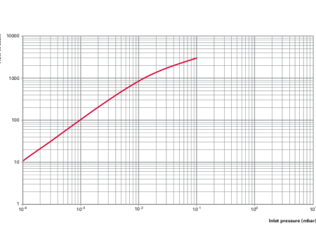 图中展示了气体流量(Flow,单位 sccm)随入口压力(Inlet pressure,单位 mbar)变化的关系,用于体现涡轮分子泵在不同压力下的气体输送流量性能,是其性能表征的重要曲线之一。