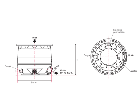 图中展示了该泵的剖面(左)和底部(右)视角,标注了入口(Inlet)、出口(Outlet,DN 40 ISO KF 接口)、吹扫口(Purge)、电气接口(Electrical connection)、水接口(Water)等关键部件的位置,以及直径(Ø315)、高度(H)等尺寸参数,用于指导泵的安装、管路连接和空间适配等工程应用场景。