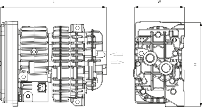 爪式真空泵的安装尺寸图纸,标注了该泵的外形尺寸(L、W、H)、进出气接口(IN/OUT)及安装结构细节,用于指导该泵在真空系统中的安装与管路连接,是真空设备集成的技术参考文件之一。
