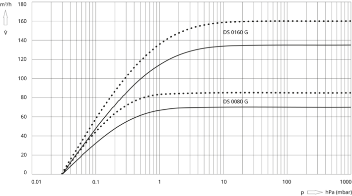 普发真空(Pfeiffer Vacuum)DS 系列真空泵(DS 0080 G、DS 0160 G)的性能曲线对比图,展示不同型号在压力下的抽气速率变化。