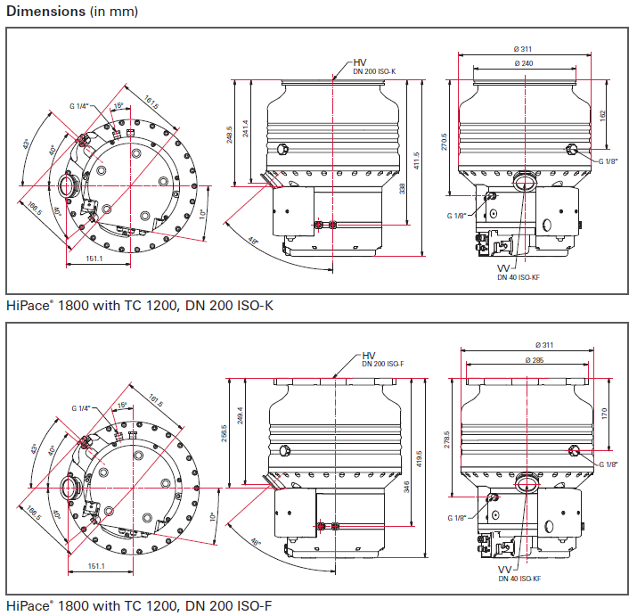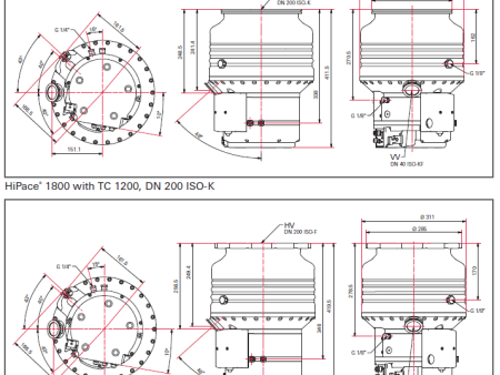 普发真空 HiPace 1800 涡轮分子泵(分别搭配 TC 1200,接口为 DN 200 ISO - K 和 DN 200 ISO - F)的尺寸图。