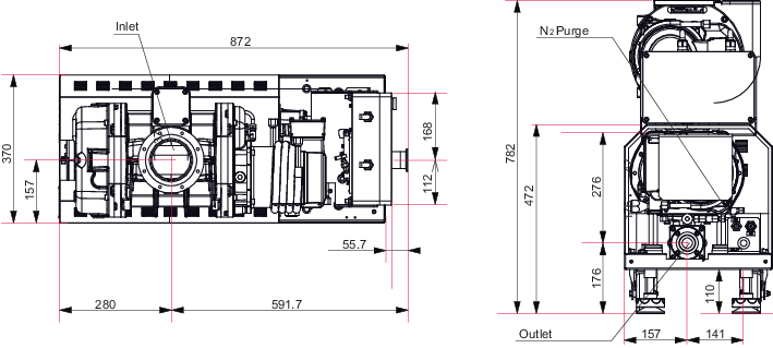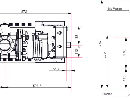 普发真空(Pfeiffer Vacuum)ACG 系列干式螺杆真空泵的尺寸图纸,标注了进气口(Inlet)、氮气吹扫口(N₂ Purge)、出气口(Outlet)等关键部件的位置及整体的长、宽、高尺寸参数,用于指导设备的安装、适配等工程应用场景。