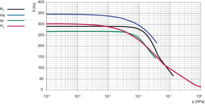 普发 HiPace 系列涡轮分子泵的抽速特性曲线,它展示了 N₂、He、Ar、H₂等不同气体在不同压强(单位:hPa)下的抽速(单位:l/s)变化规律,是评估该系列分子泵抽气性能的核心图表,用于真空系统的选型与性能匹配分析。