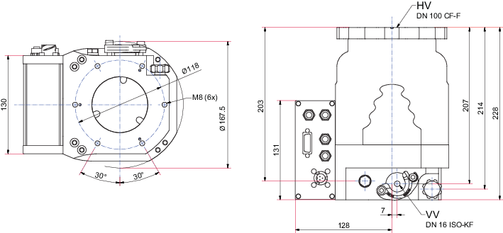 普发 HiPace 系列涡轮分子泵的安装尺寸图纸,标注了该分子泵的接口规格(如 DN 100 CF-F 进气口、DN 16 ISO-KF 排气口)、安装孔位(M8 螺栓)及各部位尺寸参数,用于指导其在真空系统中的安装适配。