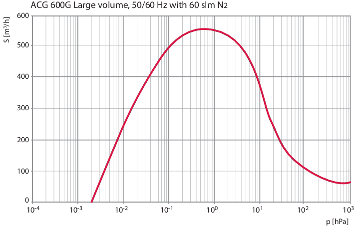 普发真空(Pfeiffer Vacuum)ACG 600G 干式螺杆真空泵的抽速曲线,用于呈现该泵在 50/60Hz 工作频率下,抽气速率(纵轴,单位 m³/h)随入口压力(横轴,单位 hPa)的变化规律,是评估其真空性能的关键图表之一。