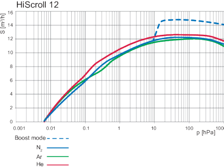 图中展示了该泵在不同压力(单位 hPa)下,对氮气(N₂)、氩气(Ar)、氦气(He)以及 Boost 模式下的抽速(单位 m³/h)表现,直观呈现了其在不同气体介质和压力区间的抽气效率特性,是该型号真空泵的核心性能技术图表。...