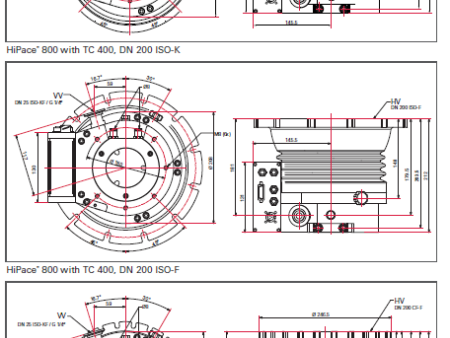 普发真空(Pfeiffer Vacuum)HiPace 800 系列涡轮分子泵(分别搭配 TC 400,接口为 DN 200 ISO - K、DN 200 ISO - F、DN 200 CF - F)的尺寸图。