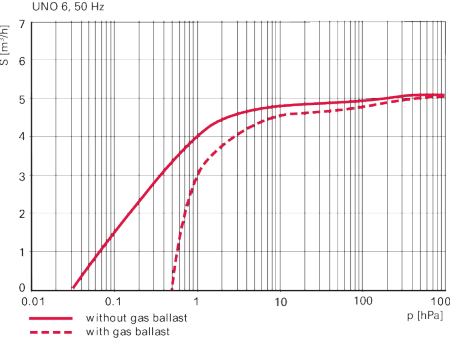 普发真空 UNO 6 真空泵(50 Hz)的抽速特性曲线。曲线展示了该泵在有无气镇(gas ballast)功能下,抽速(S,单位 m³/h)随压强(p,单位 hPa)的变化关系,直观呈现其在不同真空度区间的抽气性能,是该型号真空泵性能参数的重要可视化资料,帮助用户了解其在不同工况下的工作能力。
