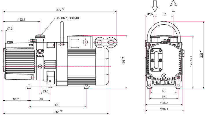 普发真空某型号双级旋片真空泵的尺寸图纸,从标注的 “2×DN 16 ISO-KF” 接口等细节来看,属于其 DUO 系列或类似双级旋片泵的结构尺寸图,用于展示泵体的各部位规格参数,为设备安装、适配管路等提供尺寸参考。