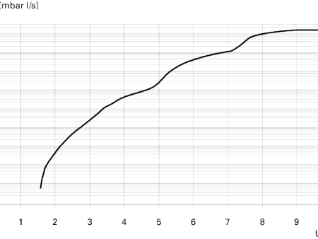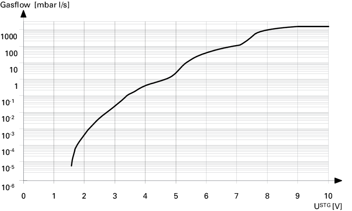 普发真空电动高真空阀门的电压 - 流量特性曲线图,横轴为控制电压 U_STG(单位 V),纵轴是气体流量(单位 mbar l/s),是该电动阀门的性能参考工具,可助力用户通过电压调控流量,适配高真空腔体、半导体设备等场景的自动化流体管控,是操作该阀门的实用指引。