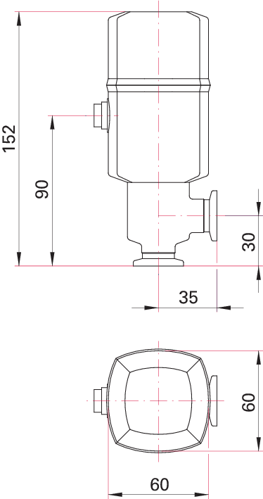 普发真空电动高真空阀门的尺寸规格图,清晰标注了总高 152mm、接口间距 35mm 等关键尺寸,是该电动阀门的安装适配参考依据。这款阀门用于高真空系统的自动化流体管控,适配实验室高真空腔体、半导体工艺设备等场景,此图可助力匹配安装空间,保障设备适配性与安装效率。