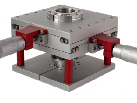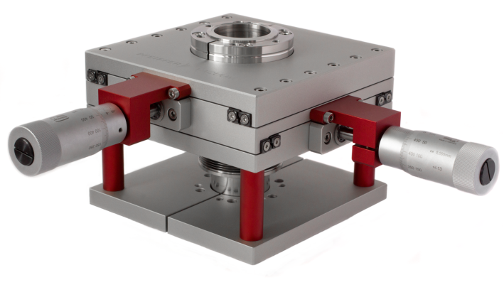 普发真空 XY 轴精密真空定位平台。它以银色为主体,搭配红色结构件,集成双旋钮微调机构,适配高 / 超高真空环境,可实现样品或部件在 XY 平面的精密平移定位,刻度清晰、调节,常用于半导体制程、科研真空实验等场景,是真空系统中实现精密定位的核心组件。