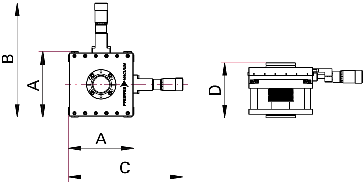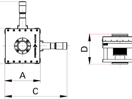 普发真空 XY 轴精密真空定位平台的工程尺寸图。它包含正视图与侧视图,标注 A、B、C、D 等关键外形与安装尺寸,用于指导该真空定位平台的安装布局、空间适配与系统集成,适配半导体、科研等高真空场景的样品精密定位需求,是真空系统设计的核心技术图纸。