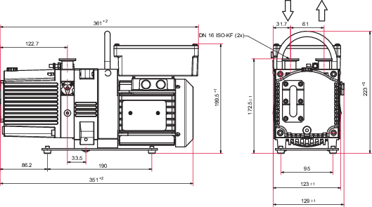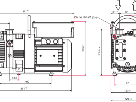 普发真空某型号双级旋片真空泵的尺寸图纸,从标注的 “DN 16 ISO-KF (2x)” 接口等细节判断,属于其 DUO 系列或类似双级旋片泵的结构尺寸图,用于展示泵体各部位的规格参数,为设备安装、管路适配等提供尺寸参考。