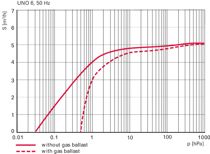 普发真空 UNO 6 真空泵(50 Hz)的抽速特性曲线。该曲线呈现了该泵在有无气镇功能下,抽速(S,单位 m³/h)随压强(p,单位 hPa)的变化关系,清晰展示其在不同真空度区间的抽气性能,是该型号真空泵性能参数的重要可视化资料,助力用户了解其在不同工况下的工作能力。