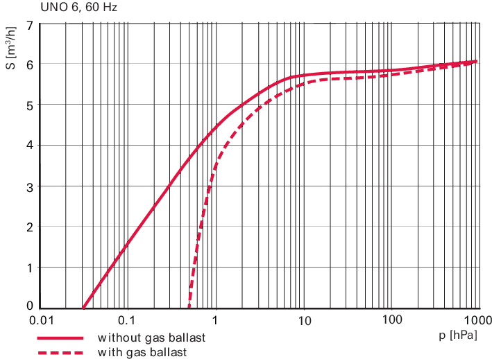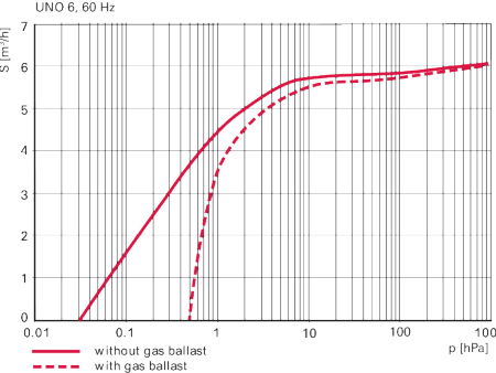 普发真空 UNO 6 真空泵(60 Hz)的抽速特性曲线。该曲线展示了该泵在有无气镇功能下,抽速(S,单位 m³/h)随压强(p,单位 hPa)的变化关系,直观呈现其在不同真空度区间的抽气性能,是该型号真空泵性能参数的重要可视化资料,可帮助用户了解其在不同工况下的工作能力。