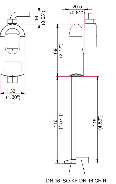 图中显示的是其长杆版本(对应接口 DN 16 ISO-KF/DN 16 CF-R),用于中低真空环境的压力测量,量程覆盖 5×10⁻⁴至 1000 hPa,常适配真空系统的自动化监测场景。