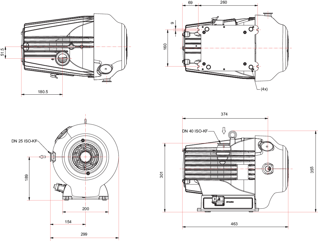 图纸从多个视角(侧视、俯视、正视等)标注了泵体的关键尺寸参数,包括真空接口规格(DN 25 ISO-KF、DN 40 ISO-KF)、安装尺寸、外形轮廓尺寸等,用于设备的安装适配、空间布局规划以及技术参数确认,是该系列涡旋真空泵工程应用和机械设计的重要技术文档。