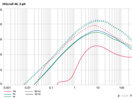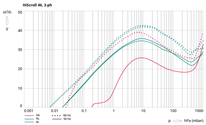 该曲线展示了 HiScroll 46 三相型号在不同气体(He 氦气、N₂氮气、Ar 氩气)、不同电源频率(50 Hz、60 Hz)下,抽气速率(单位:m³/h)随入口压力(单位:hPa,毫巴)的变化关系,反映了泵在不同工况下对不同气体的抽气性能,是真空设备选型和性能评估的重要参考图表。