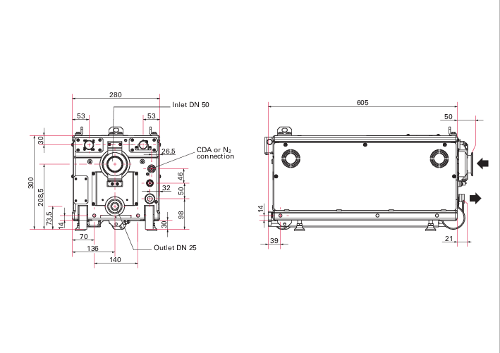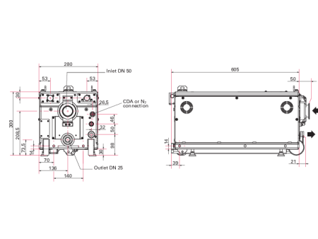 普发真空(Pfeiffer Vacuum)A100L 干式真空泵的尺寸图纸,标注了该泵的进气口(Inlet DN 50)、出气口(Outlet DN 25)、压缩空气或氮气接口(CDA or N₂ connection)等关键部件的位置及整体的长、宽、高尺寸参数,用于指导设备的安装、适配等工程应用场景。