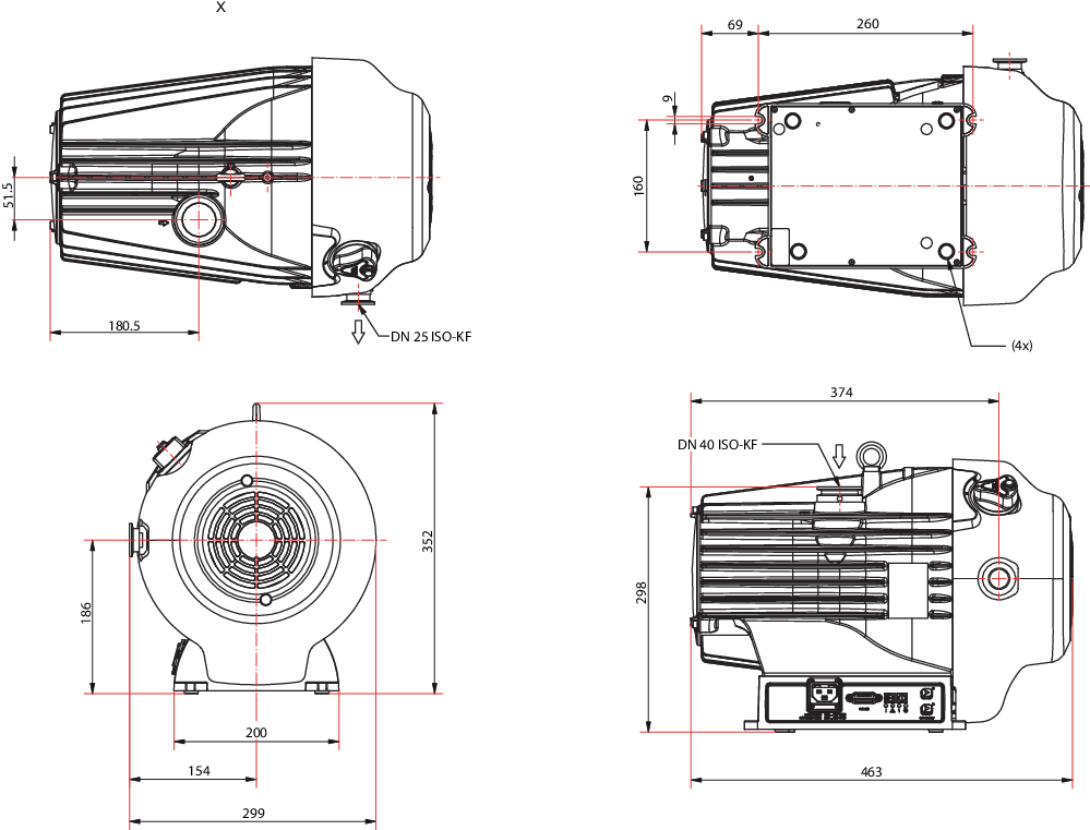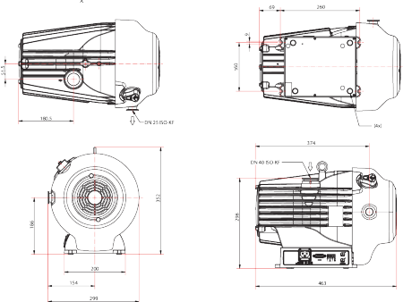 普发真空 HiScroll 系列干式涡旋泵的尺寸图纸,属于普发真空(Pfeiffer Vacuum)HiScroll 系列的技术资料,用于展示该泵的外观尺寸、接口规格(如 DN 25/DN 40 ISO-KF 接口)及安装细节,帮助用户进行设备选型、安装布局等工作。