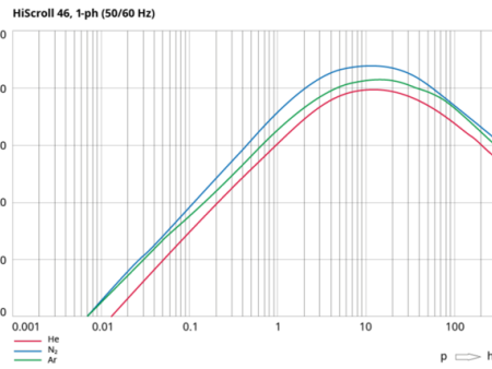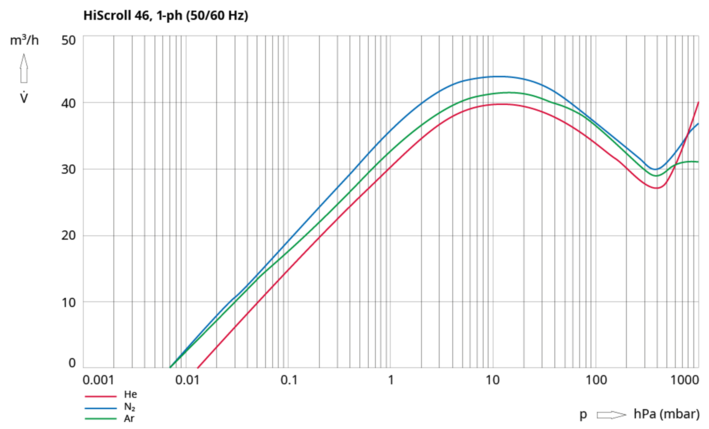 普发真空 HiScroll 46 干式涡旋泵(单相 50/60 Hz)的抽速性能曲线。