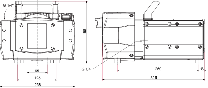 普发真空(PFEIFFER VACUUM)MVP 070-3 型干式隔膜真空泵的外形尺寸图,包含多视角视图,标注了 G 1/4" 气体接口及设备各维度尺寸(单位 mm),是该泵安装布局、管路连接的核心技术图纸。