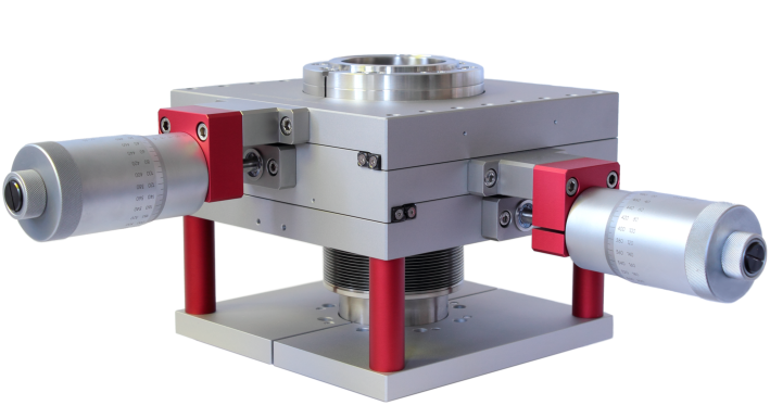 精密十字接头滚柱导轨,采用零背隙设计,无滑粘效应,导轨与驱动部件无磨损、免维护。结构稳定,可大幅降低压力变化带来的位置偏移,搭配大尺寸转轴千分尺螺丝,操作便捷、读数清晰。配备双向刻度,X、Y 向最大行程可同时充分利用,带通孔连接法兰与螺纹孔可移动法兰,适配精密定位与高精度运动场景。