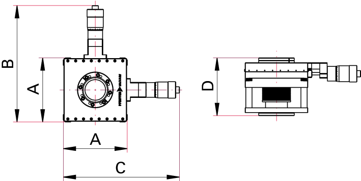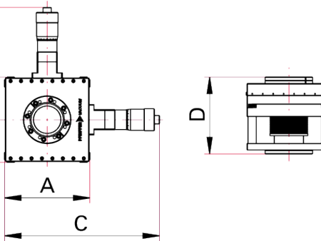 普发真空 XY 轴精密真空定位平台(带升降补偿)的工程尺寸图。它包含正视图与侧视图,标注 A、B、C、D 等关键外形与安装尺寸,用于指导该真空定位平台的安装布局、空间适配与系统集成,适配半导体、科研等高真空场景的样品精密定位需求,是真空系统设计的核心技术图纸。