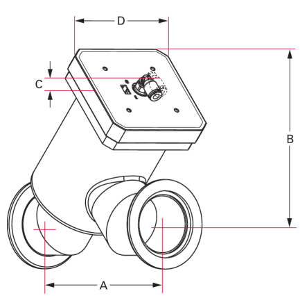 电动真空角阀的安装尺寸图,是该阀门的配套技术图纸,对应电动真空角阀产品。图中标注了 A、B、C、D 等关键安装尺寸参数,用于指导该电动真空角阀在真空系统中的安装适配,帮助确认其安装空间与管路连接的匹配情况,是该阀门安装过程的重要参考图纸,可保障安装契合系统布局。