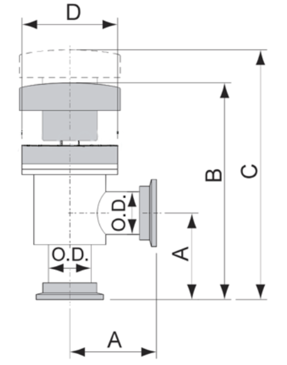 KF 系列高真空手动挡板阀(手动角阀)的结构尺寸图,对应实物为不锈钢真空手动角阀。图中标注了 A(法兰外径 / 安装尺寸)、B(阀体高度)、C(总高度)、D(手轮直径)及 O.D.(通径)等关键参数,用于选型与安装设计。该阀适配 KF 快装法兰,密封可靠、操作轻便,广泛用于真空管路通断控制,是真空系统的核心配件。