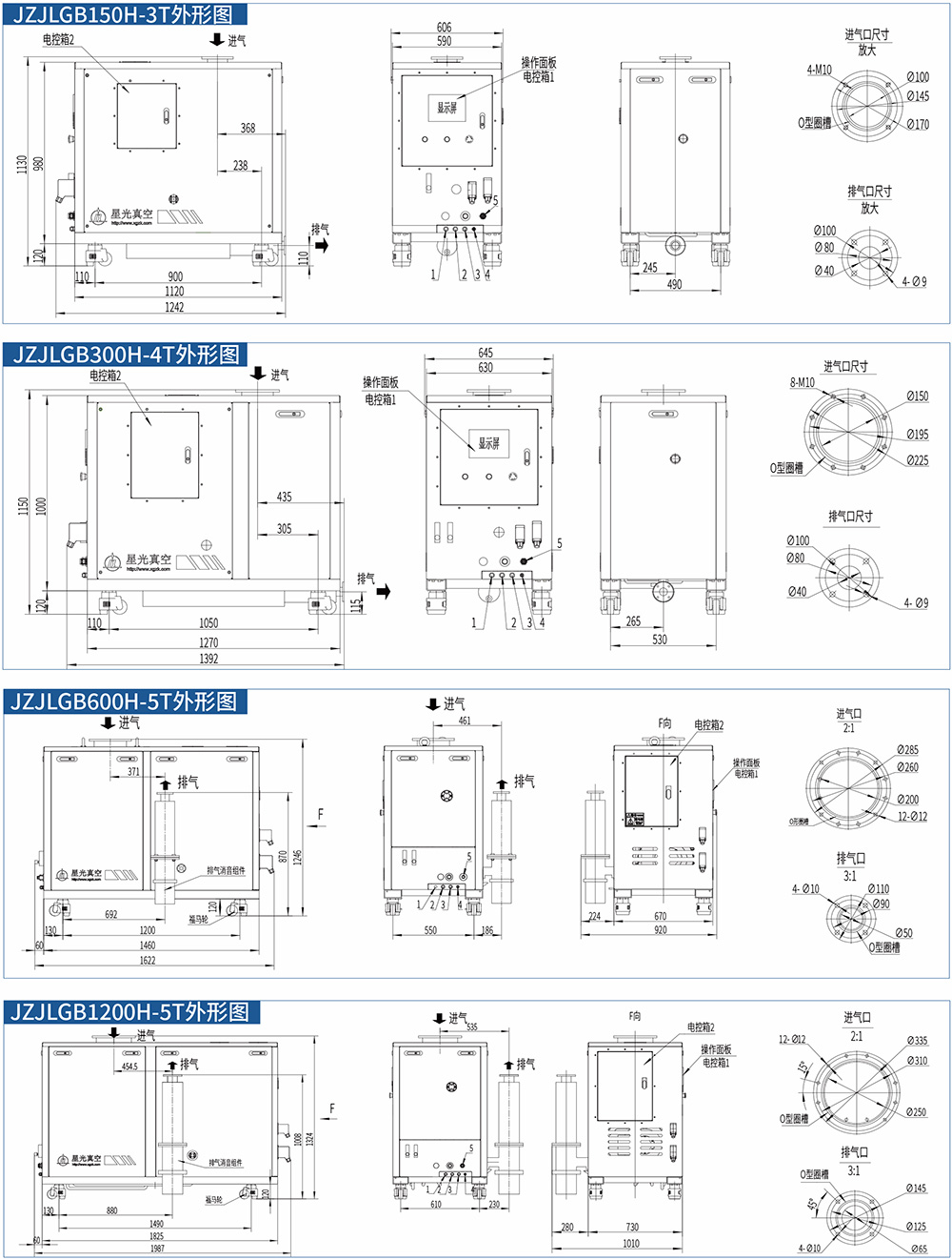 星光真空JZJLG 系列干式螺杆真空泵机组的外形尺寸图,涵盖 JZJ LGB150H-3T、300H-4T、600H-5T、1200H-5T 全型号。图纸标注了设备进气 / 排气口尺寸、电控箱布局、操作面板位置及整机长宽高等安装参数,为设备安装、管路对接、现场布局提供尺寸依据,适配不同工业真空场景的工程设计需求。